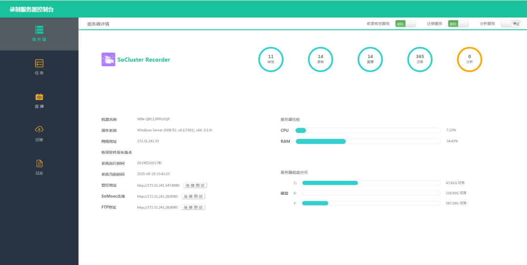 新增录播服务器控制台 随着智慧集控系统连接的设备越来越多,对于服务器的维护管理也就越来越重要。5.0版本新增的录播服务器控制台,能够详细地显示每一台服务器的运行状态,以及所管辖教室的录制、直播和资源迁移情况。